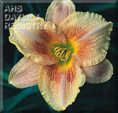 | Description : peach base overlaid with a heavy stippling of red to orange speckles above a green throat | |